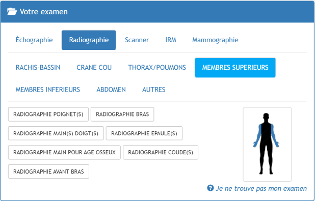 Cliquez sur le type d'imagerie que vous souhaitez réserver (IRM, scanner, scintigraphie, etc) puis choisissez le type d'examen correspondant à votre ordonnance dans la liste proposée :