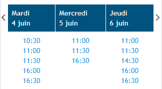 Précisez éventuellement les horaires auxquels vous êtes disponible. Les créneaux de réservation libres s'affichent. Cliquez sur un créneau horaire pour démarrer la réservation :
