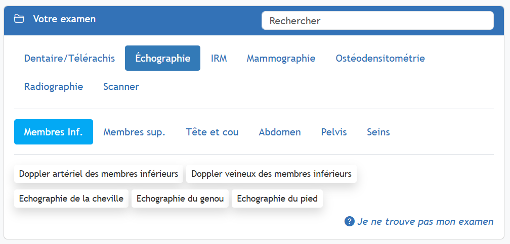 Cliquez sur le type d'imagerie que vous souhaitez réserver (IRM, scanner, scintigraphie, etc) puis choisissez le type d'examen correspondant à votre ordonnance dans la liste proposée :