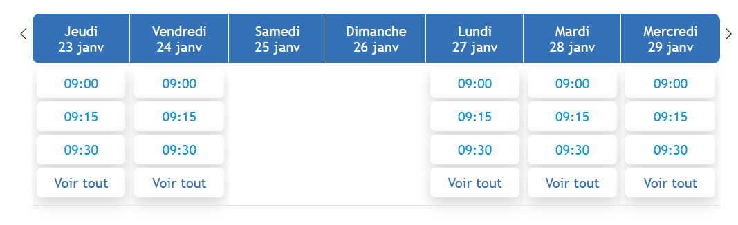 Précisez éventuellement les horaires auxquels vous êtes disponible. Les créneaux de réservation libres s'affichent. Cliquez sur un créneau horaire pour démarrer la réservation :