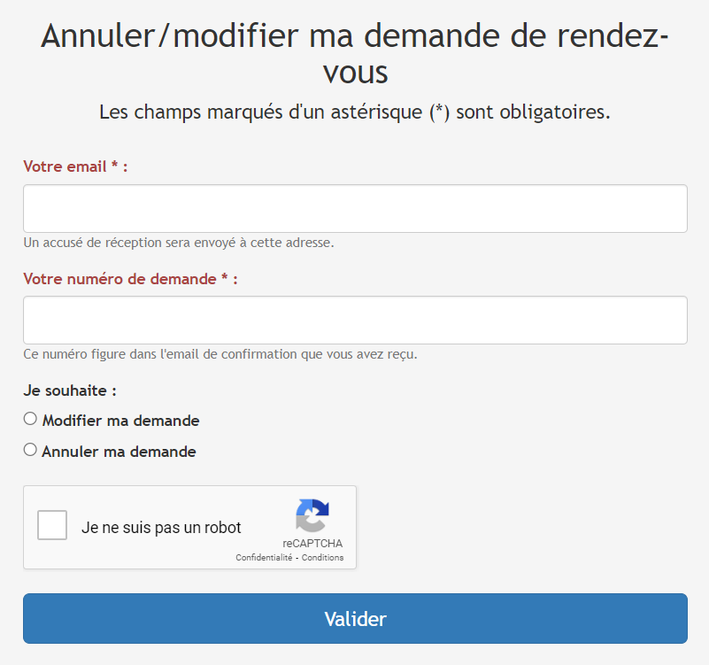 Saisissez ensuite le numéro de demande ainsi que l'email ayant servi à la soumission de la demande de rendez-vous et effectuez vos modifications :