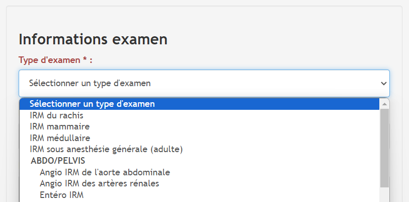 Sélectionnez ensuite dans la liste déroulante l'examen pour lequel vous souhaitez faire une demande :