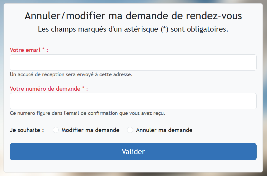 Saisissez ensuite le numéro de demande ainsi que l'email ayant servi à la soumission de la demande de rendez-vous et effectuez vos modifications :