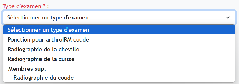 Sélectionnez ensuite dans la liste déroulante l'examen pour lequel vous souhaitez faire une demande :